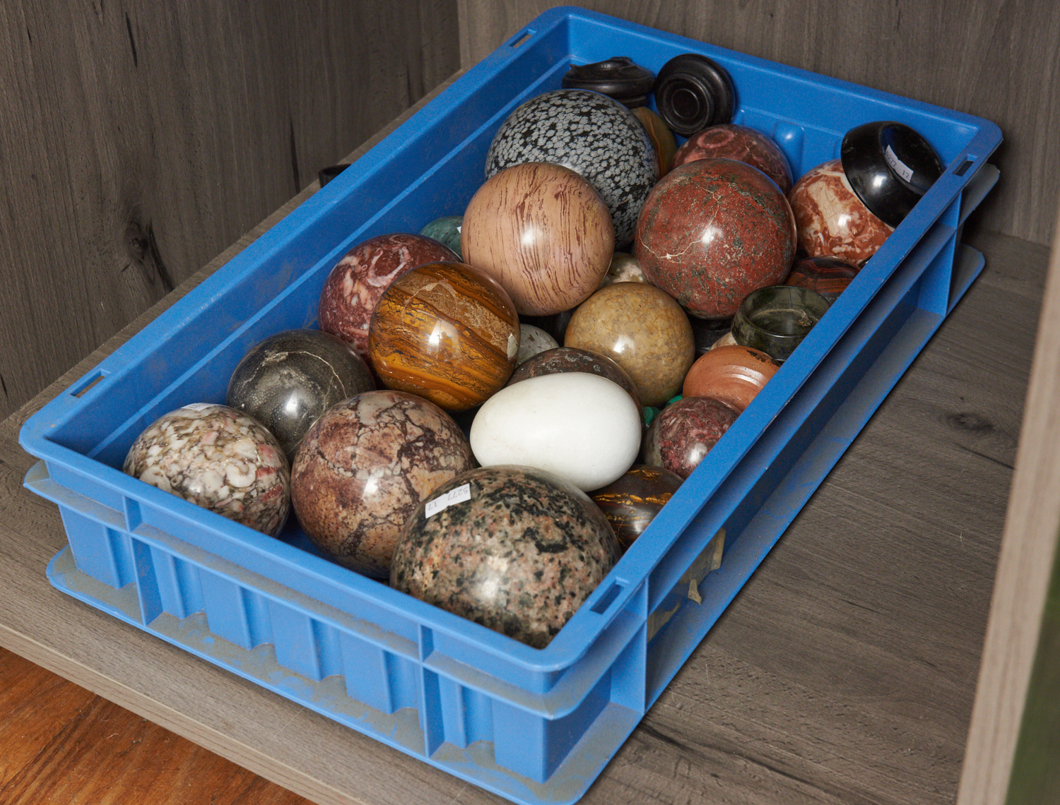A LARGE COLLECTION OF SPHERICAL STONE SPECIMENS, SOME WITH STANDS, LEONARD JOEL LOCAL DELIVERY SIZE: SMALL