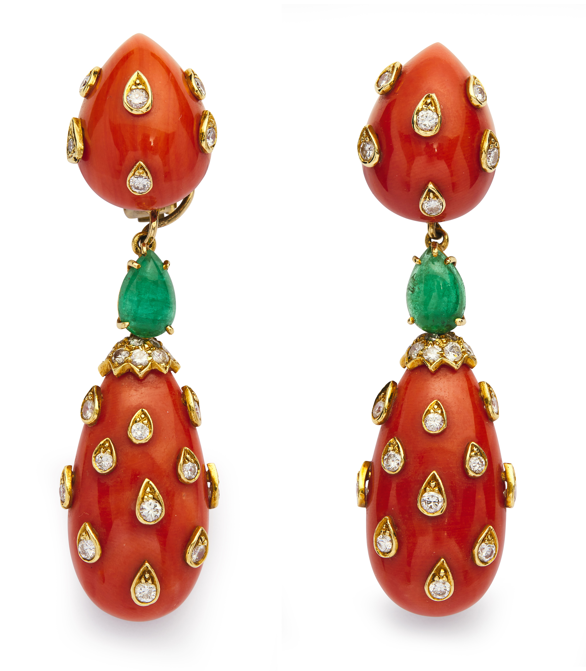 AN IMPRESSIVE PAIR OF 18CT GOLD, EMERALD, DIAMOND AND CORAL PENDANT EARRINGS, DAVID WEBB