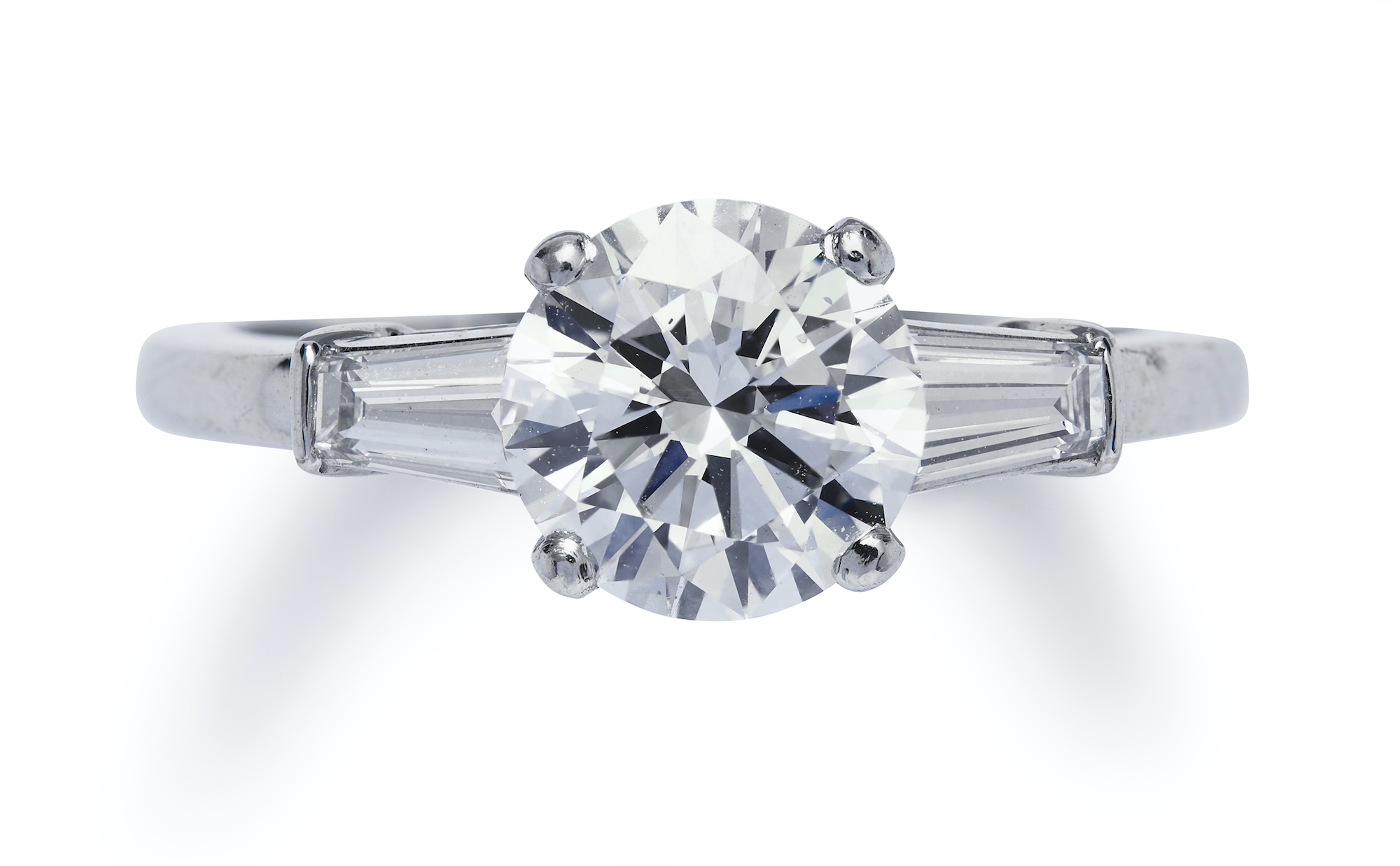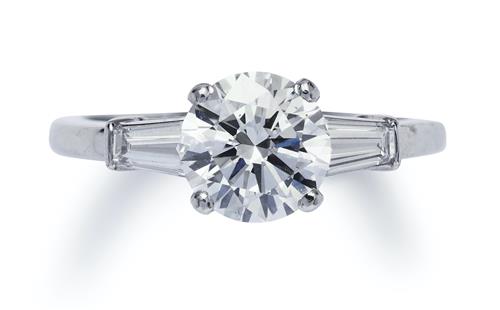The brilliant-cut diamond weighing 1.52 carats, is claw-set between a pair of baguette diamond shoulders, size J.