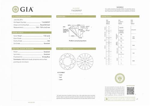 a GIA report numbered 1162282927, dated 30 June 2014, stating that the 1.52 carat diamond is F colour, VS2 clarity;