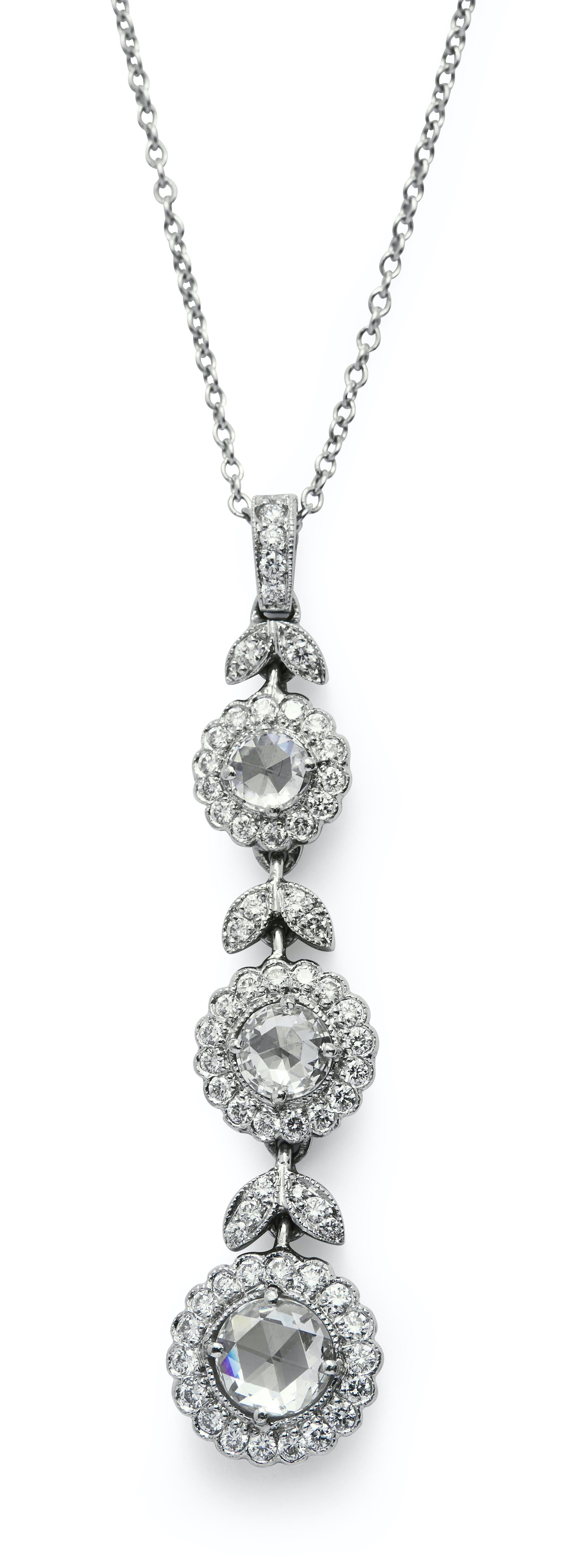 Modelled as a line of three graduated clusters centring a millegrain-set rose-cut diamond framed by a halo of brilliant-cut diamonds between twin leaf connectors millegrain-set with diamonds, the surmount similarly set, completed by a fine trace chain, circumference approximately 400mm, pendant length approximately 42mm, stamped T & Co. for Tiffany & Co.