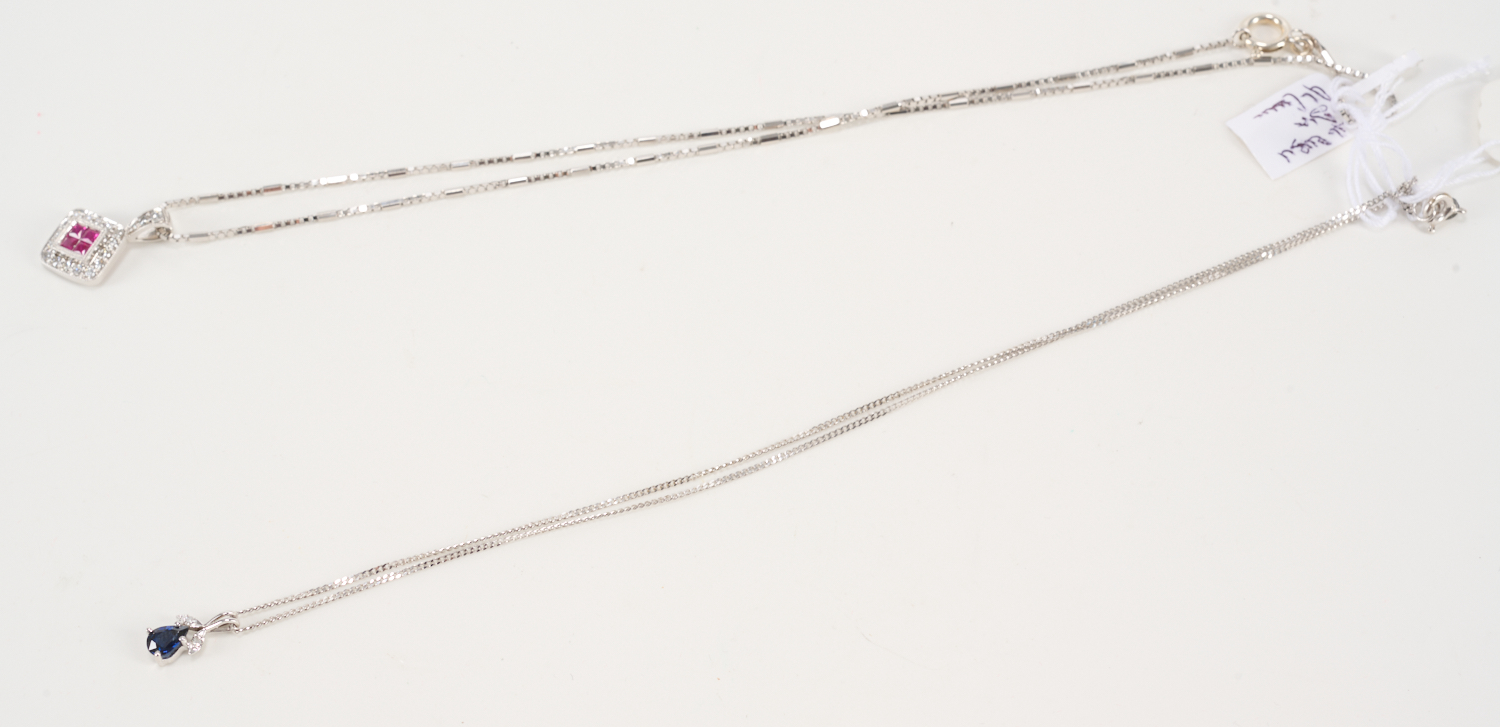 A RUBY AND DIAMOND SQUARE PENDANT IN 14CT WHITE GOLD, TO A CHAIN IN 9CT WHITE GOLD, TO A STERLING SILVER CLASP FITTING, AND A SAPPHIRE SET PENDANT AND CHAIN IN 9CT WHITE GOLD