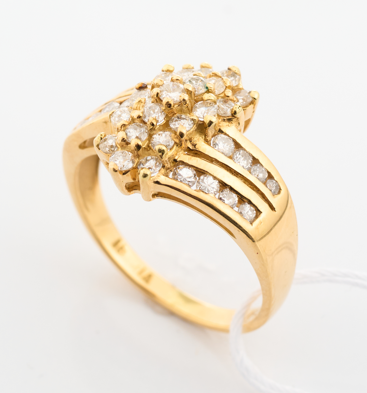 A DIAMOND DRESS RING FEATURING CENTRAL DIAMOND CLUSTER, SHOULDERED BY TWO ROWS OF CHANNEL DIAMONDS, IN 18CT GOLD, SIZE O, 5.1GMS