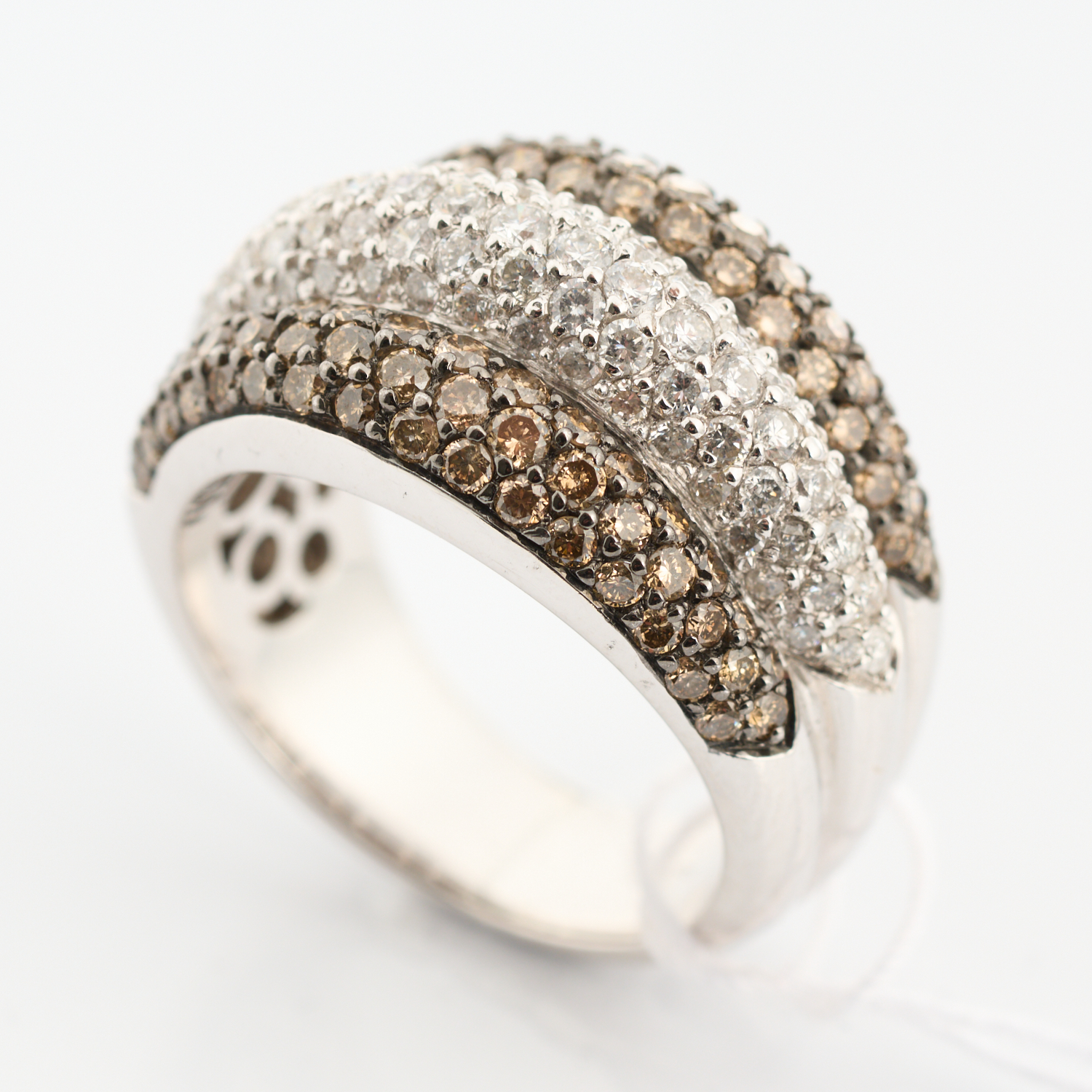 A DIAMOND COCKTAIL RING FEATURING WHITE AND COGNAC DIAMONDS IN 18CT WHITE GOLD, SIZE M/N, 13.5GMS