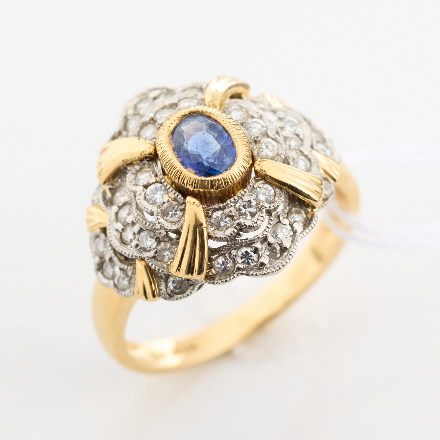 A SAPPHIRE AND DIAMOND DRESS RING IN 18CT GOLD AND PLATINUM, SIZE L/M, 5.9GMS