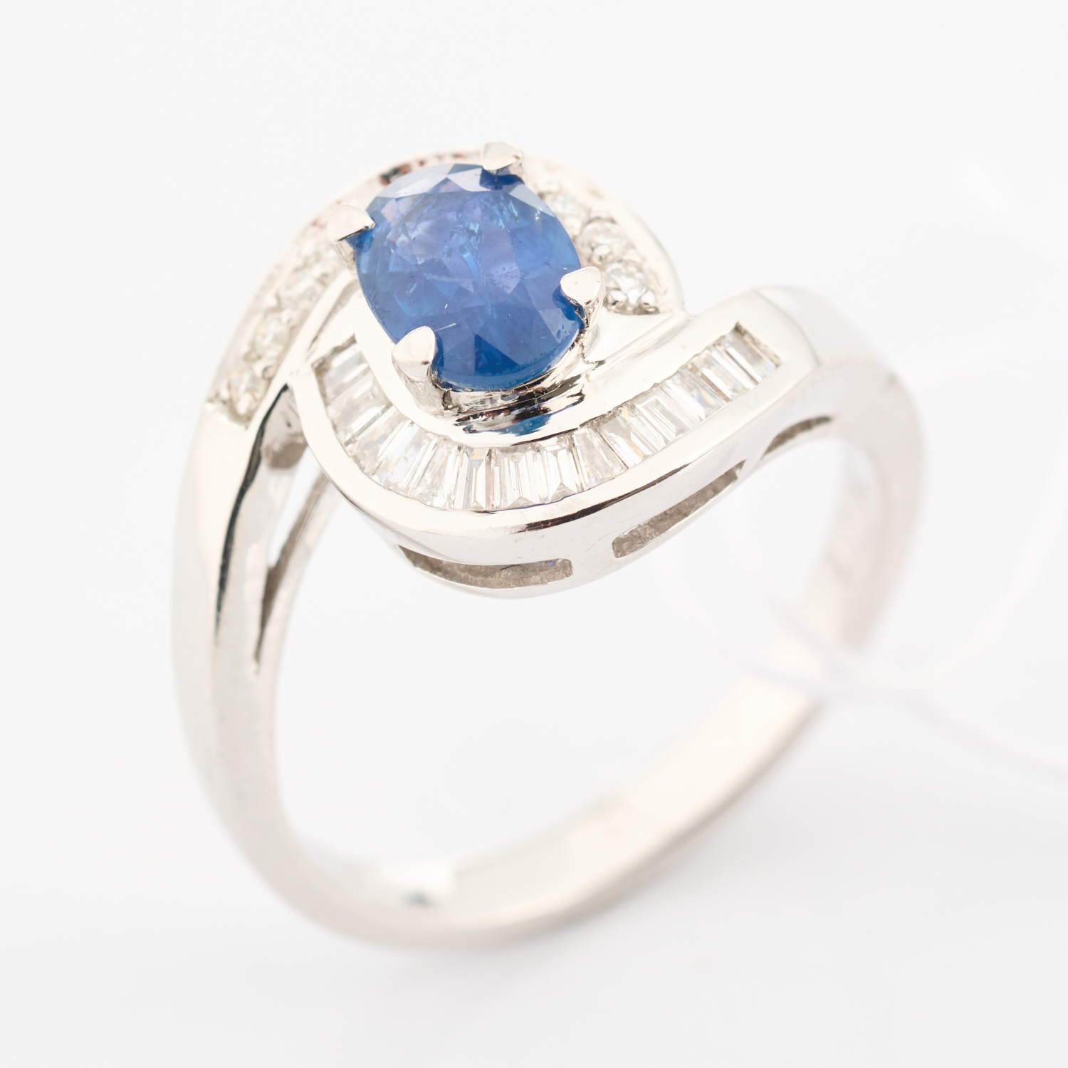 A DIAMOND AND SAPPHIRE DRESS RING FEATURING A CENTRAL OVAL CUT SAPPHIRE WITHIN A SURROUND OF BAGUETTE AND ROUND CUT DIAMONDS, IN 18CT WHITE GOLD, SIZE M, 5.1GMS