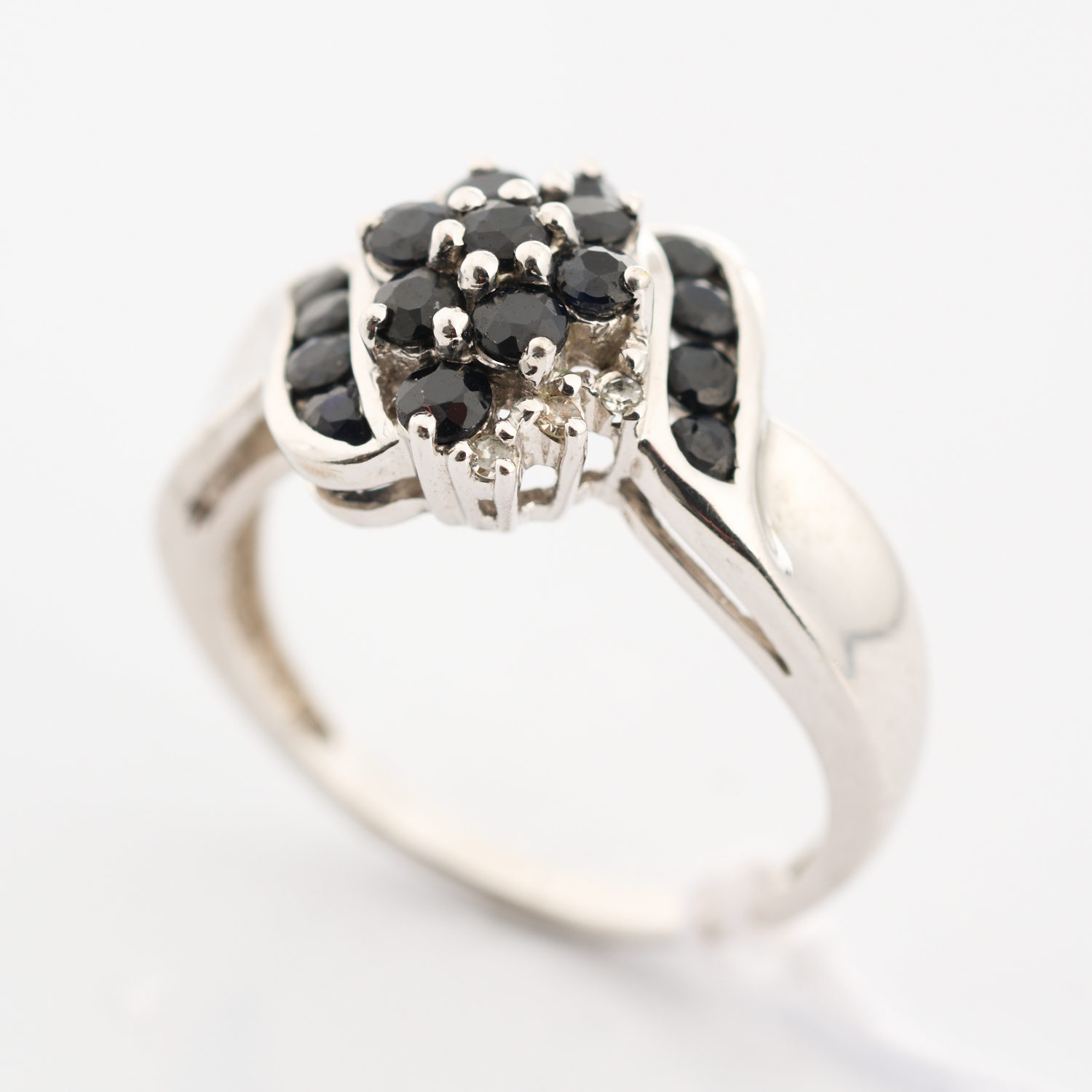 A SAPPHIRE CLUSTER RING IN 9CT WHITE GOLD, SIZE M/N, 3.4GMS