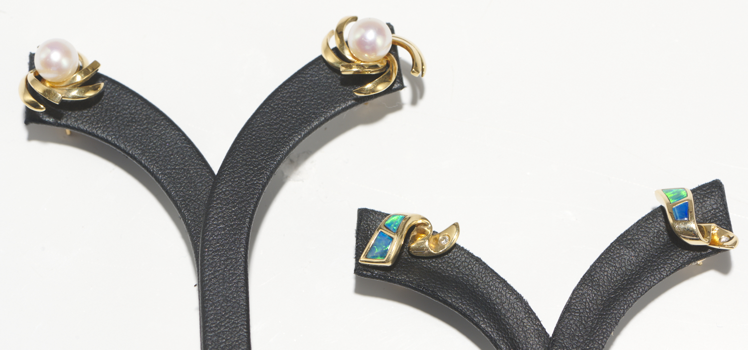 A PAIR OF CULTURED PEARL EARRINGS IN 9CT GOLD WITH A PAIR OF OPAL AND DIAMOND EARRINGS IN 14CT GOLD, TO POST FITTINGS