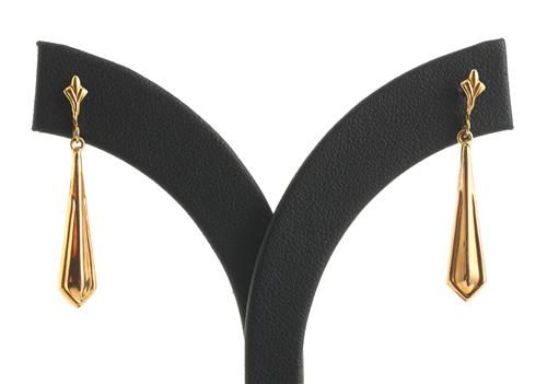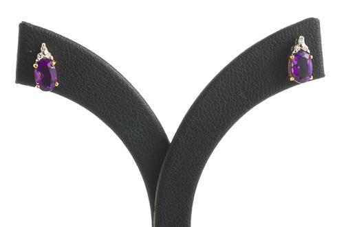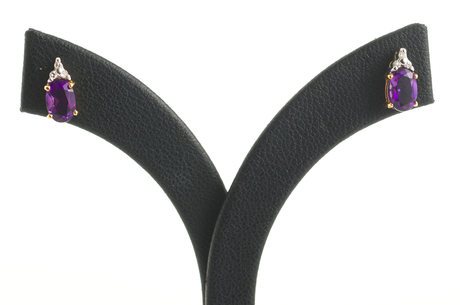 A PAIR OF AMETHYST AND DIAMOND EARRINGS, EACH FEATURING A CENTRAL PEAR CUT AMETHYST, TO POST AND BUTTERFLY FITTINGS, IN TWO TONE 9CT GOLD