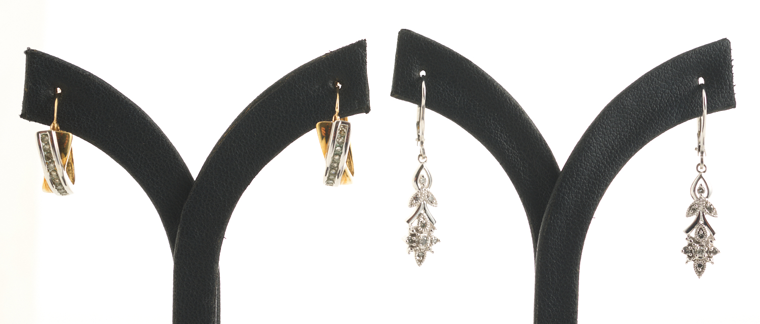 A PAIR OF DIAMOND HALF HOOP EARRINGS TO HINGE BACK FITTINGS, IN TWO TONE 9CT GOLD, TOGETHER WITH A PAIR OF FLORAL DESIGN DIAMOND DROP EARRINGS, TO EUROPEAN HOOK FITTINGS, IN 9CT WHITE GOLD