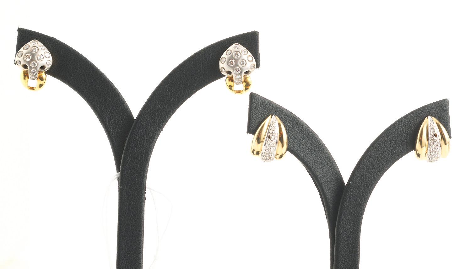 A PAIR OF DIAMOND EARRINGS IN TWO TONE 9CT GOLD, TO POST FITTINGS, TOGETHER WITH A PAIR OF DIAMOND EARRINGS IN TWO TONE 9CT GOLD, TO POST FITTINGS