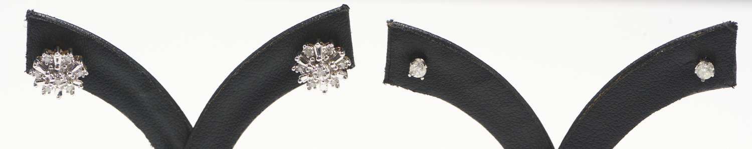 A PAIR OF TWO TONED DIAMOND CLUSTER EARRINGS IN 9CT GOLD, TO POST FITTINGS, WITH A PAIR OF SOLITAIRE DIAMOND STUD EARRINGS IN 9CT WHITE GOLD, TO POST FITTINGS