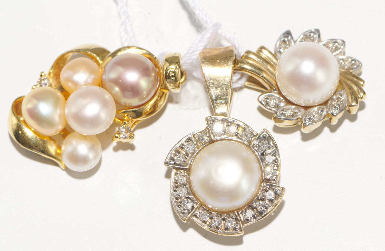 THREE CULTURED PEARL AND DIAMOND PENDANTS, TWO IN 9CT GOLD AND ONE IN 14CT GOLD