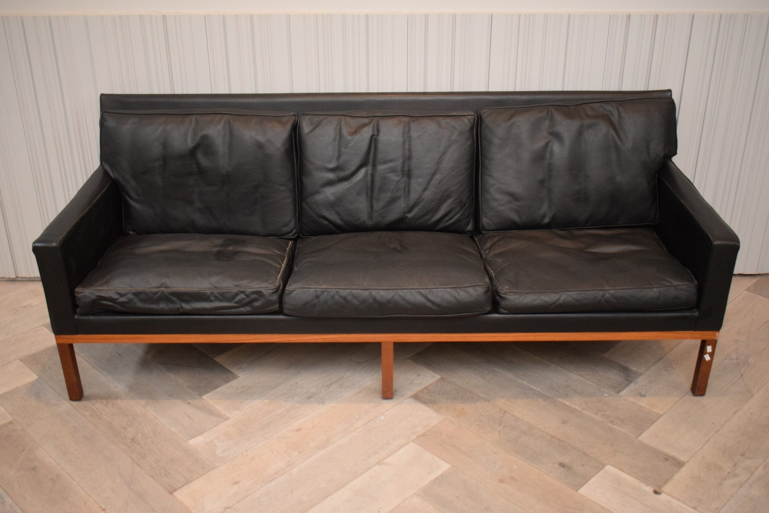 A DANISH THREE SEAT SOFA (MISSING BASE LINING) (AF) (76H x 195W x 77D CM) (PLEASE NOTE THIS HEAVY ITEM MUST BE REMOVED BY CARRIERS AT THE CUSTOMER'S EXPENSE. LEONARD JOEL STAFF CANNOT ASSIST CARRYING THIS ITEM) (X-LARGE ITEM)