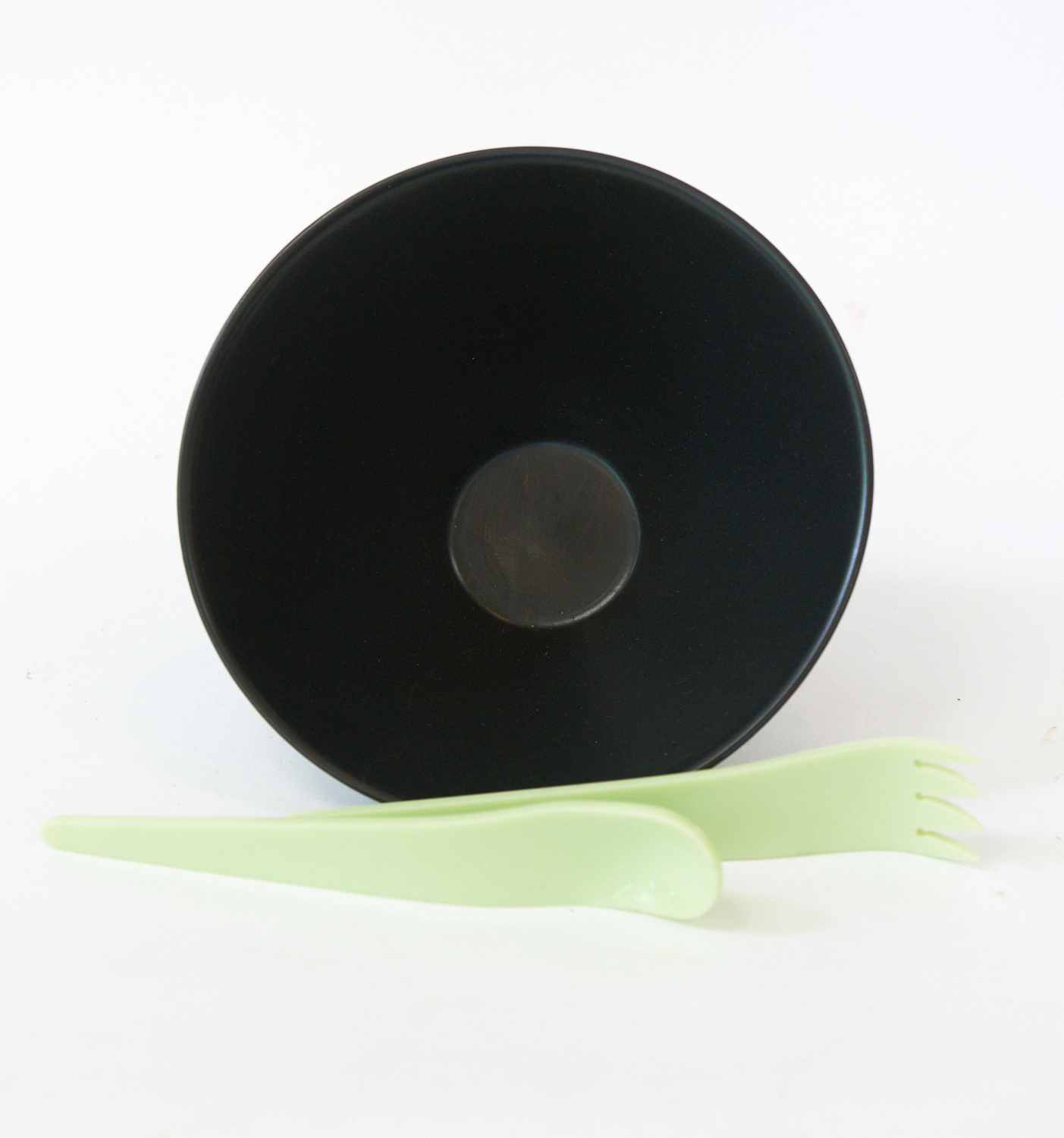 A PAIR OF 1950S PALE GREEN LUCITE SALAD SERVERS AND A BLACK GLAZED SALAD BOWL, LEONARD JOEL LOCAL DELIVERY SIZE: SMALL
