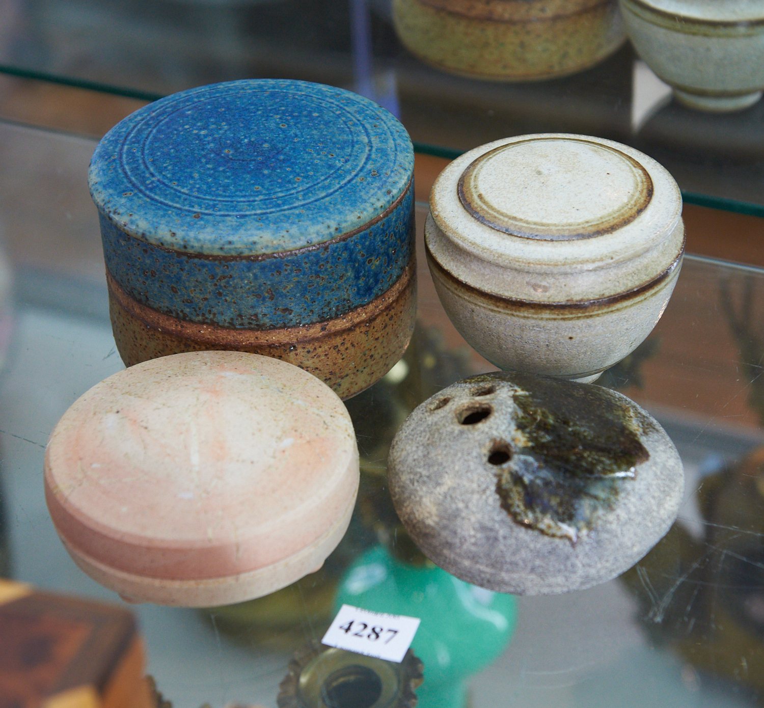 THREE AUSTRALIAN POTTERY LIDDED BOWLS AND A PEBBLE VASE BY VAGN NYKEL, LEONARD JOEL LOCAL DELIVERY SIZE: SMALL