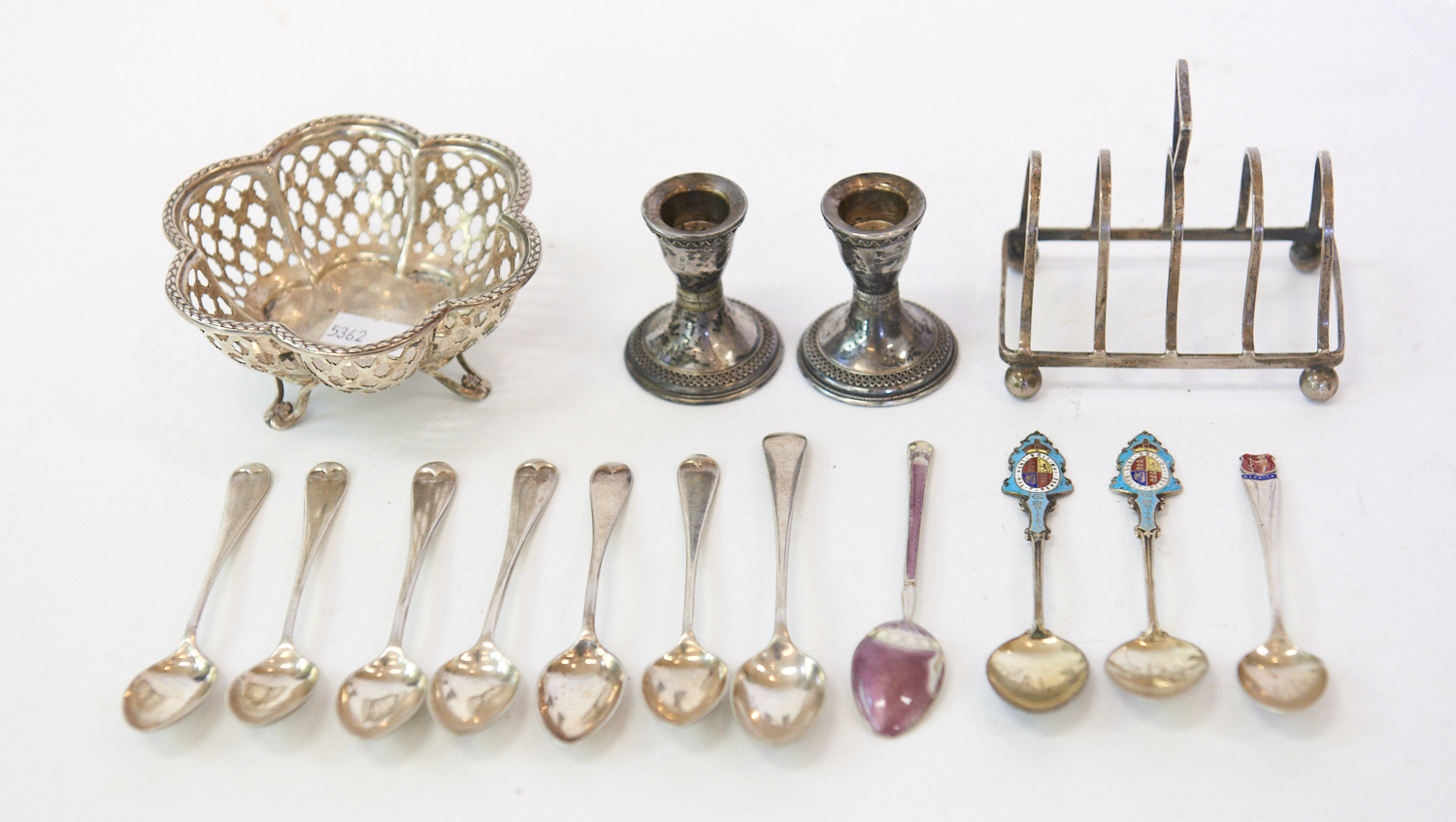 A COLLECTION OF STERLING SILVER ITEMS INCLUDING SPOONS, TOAST RACK, DISH, ETC TOGETHER WITH SEVEN EP TEASPOONS LEONARD JOEL LOCAL DELIVERY SIZE: SMALL