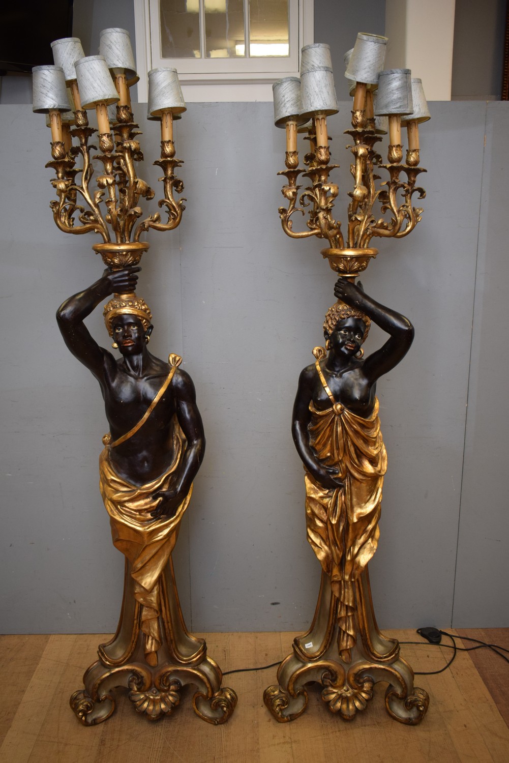 A LARGE PAIR OF BLACKAMOOR STYLE LAMPS, ONE MALE AND ONE FEMALE, WITH NINE BRANCHES EACH (A/F) (222H CM) (PLEASE NOTE THIS HEAVY ITEM MUST BE REMOVED BY CARRIERS AT THE CUSTOMER'S EXPENSE. LEONARD JOEL STAFF CANNOT ASSIST CARRYING THIS ITEM) (X-LARGE ITEM)