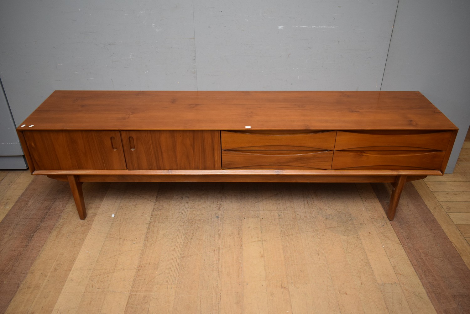 A MID-CENTURY STYLE TEAK LOW RISE SIDEBOARD (61H x 220W x 50D CM) (PLEASE NOTE THIS HEAVY ITEM MUST BE REMOVED BY CARRIERS AT THE CUSTOMER'S EXPENSE. LEONARD JOEL STAFF CANNOT ASSIST CARRYING THIS ITEM) (X-LARGE ITEM)