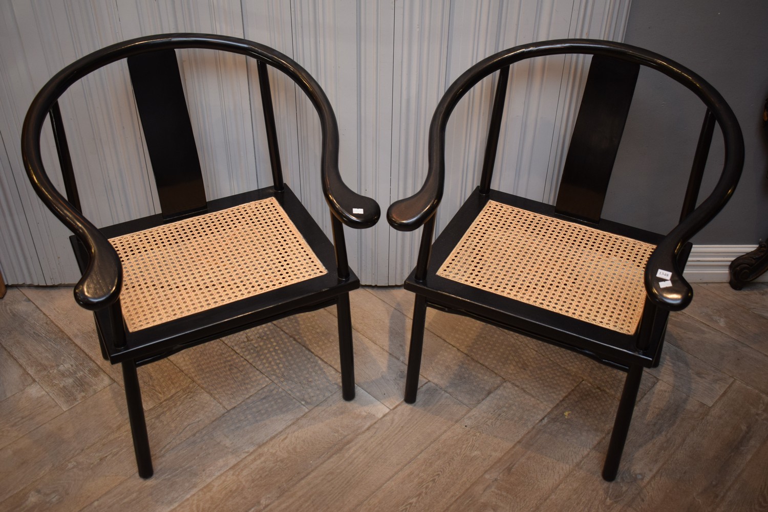 A PAIR OF TEAK AND RATTAN ACCENT CHAIRS (86H x 69W x 60D CM) (LEONARD JOEL DELIVERY SIZE: LARGE)
