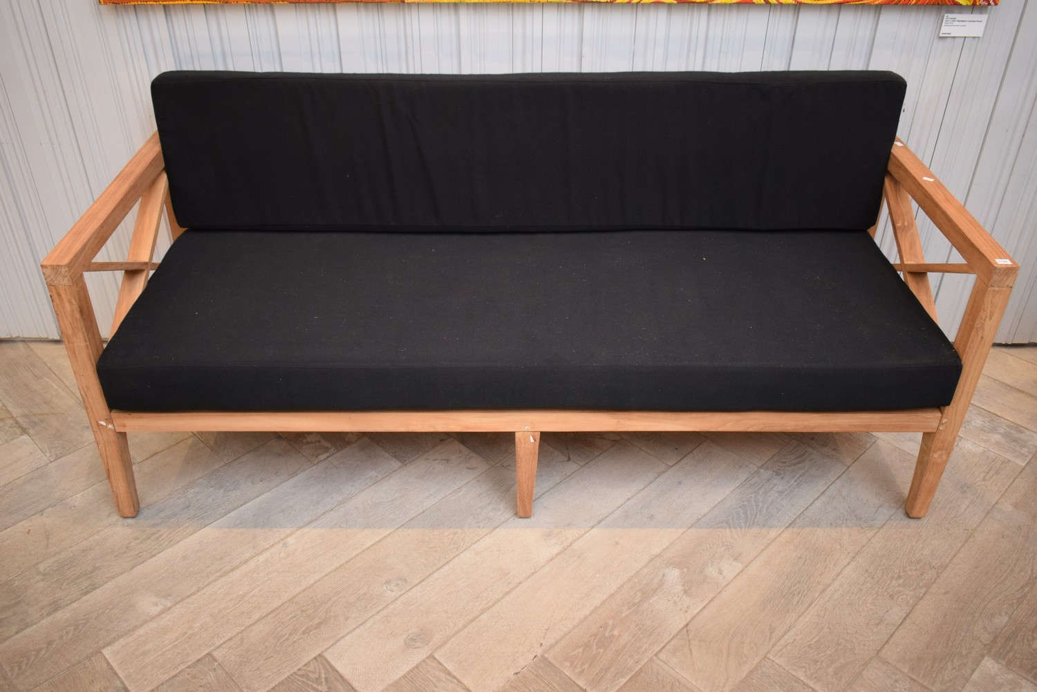 A MODERN TEAK GARDEN BENCH SEAT WITH WATERPROOF CUSHION (A/F) (65H x 180W x 67D CM) (PLEASE NOTE THIS HEAVY ITEM MUST BE REMOVED BY CARRIERS AT THE CUSTOMER'S EXPENSE. LEONARD JOEL STAFF CANNOT ASSIST CARRYING THIS ITEM) (X-LARGE ITEM)