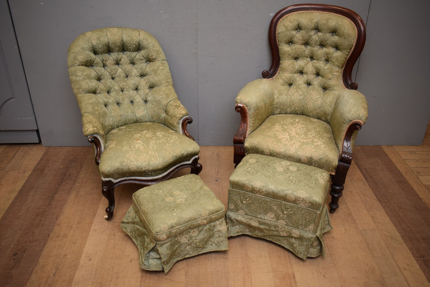 A VICTORIAN LADIES AND GENTS CHAIRS WITH MATCHING FOOTSTOOLS (A/F) (106H x 75W x 78D CM) (LEONARD JOEL DELIVERY SIZE: LARGE)