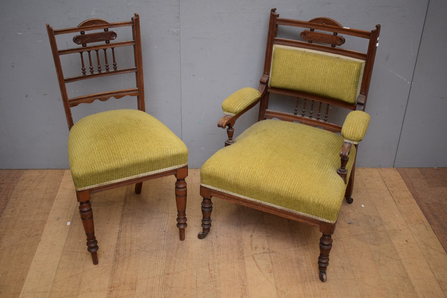 AN EDWARDIAN ARM CHAIR AND SIDE CHAIR IN GREEN UPHOLSTERY (86H x 57W x 54D CM) (LEONARD JOEL DELIVERY SIZE: LARGE)