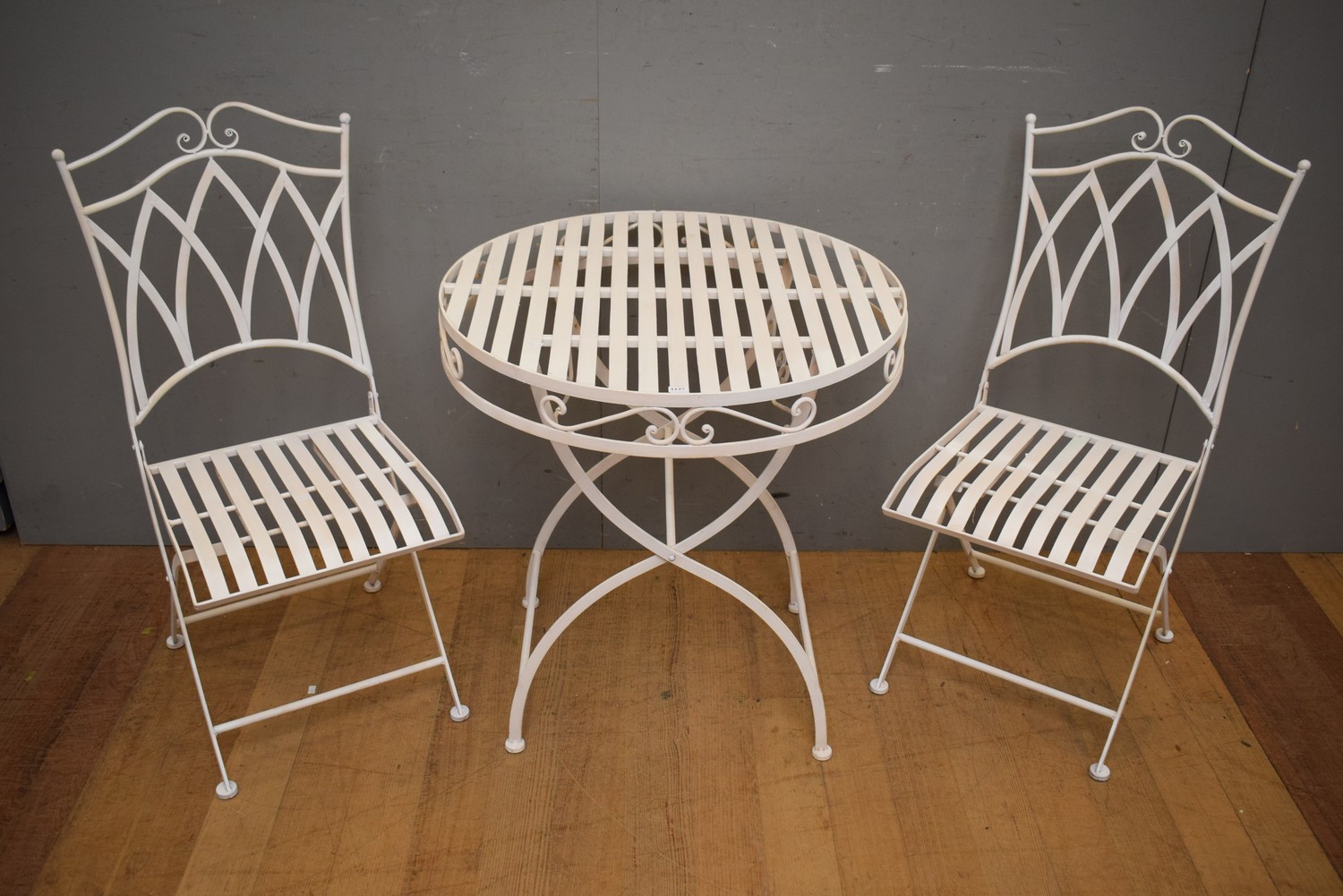 A THREE PIECE OUTDOOR SETTING (A/F) (TABLE 74H x 70D CM) (LEONARD JOEL DELIVERY SIZE: LARGE)