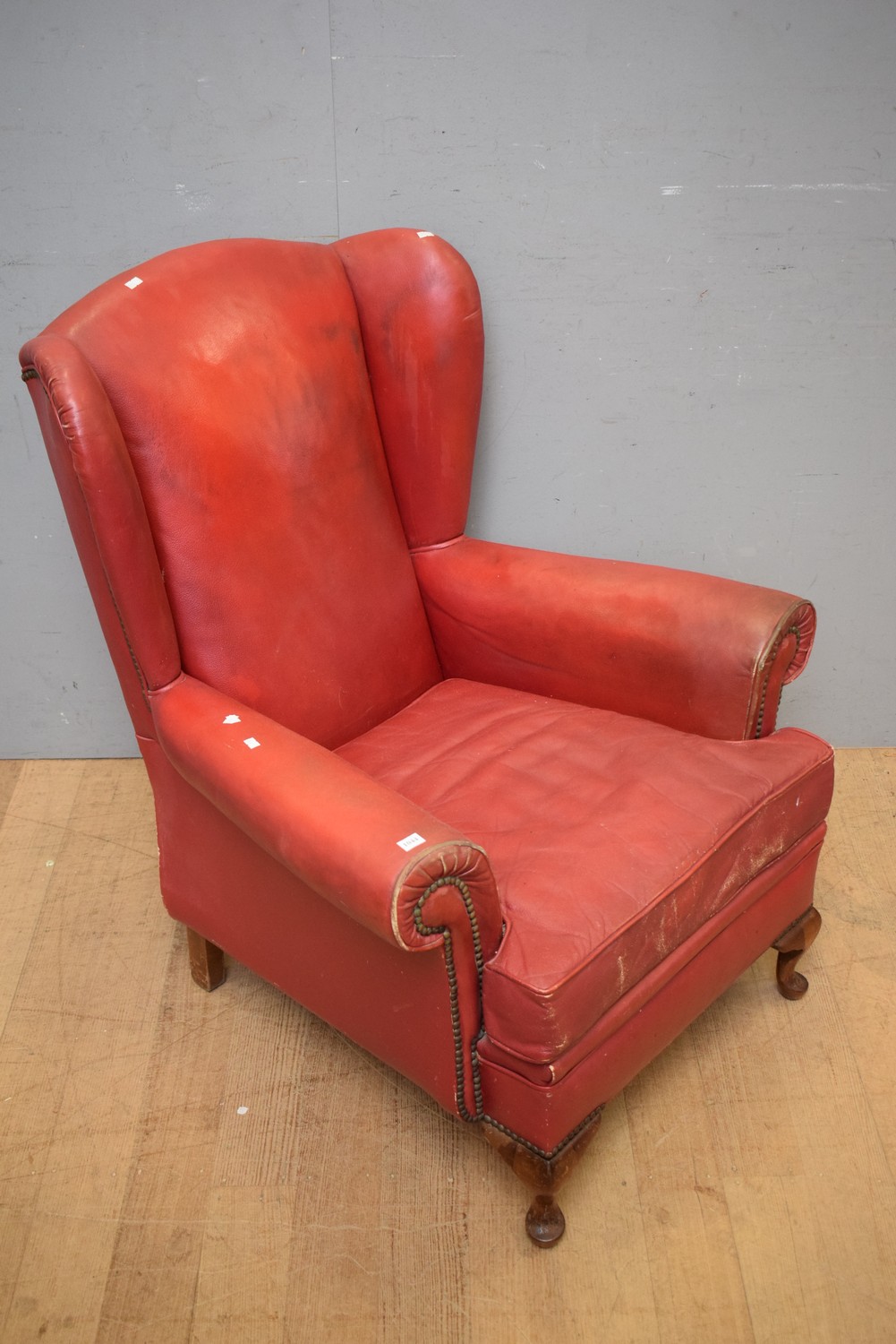 A RED LEATHER WINGBACK ARM CHAIR (A/F) (98H x 83W x 86D CM) (LEONARD JOEL DELIVERY SIZE: LARGE)