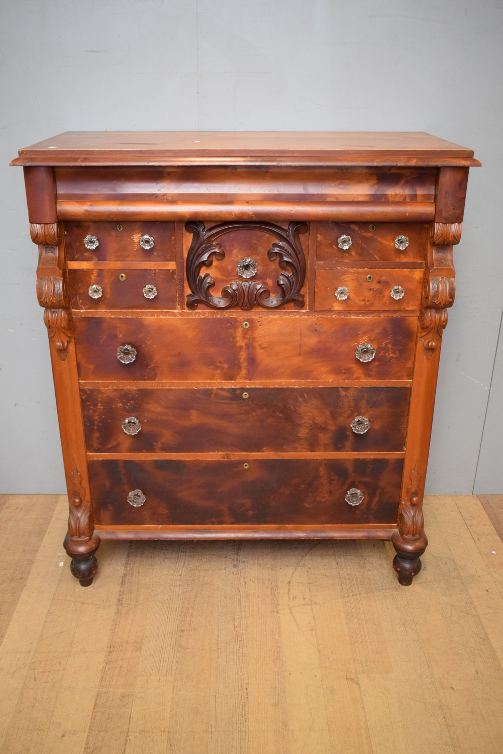A 19TH CENTURY CHEST OF DRAWERS (143H x 125W x 59D CM) (PLEASE NOTE THIS HEAVY ITEM MUST BE REMOVED BY CARRIERS AT THE CUSTOMER'S EXPENSE. LEONARD JOEL STAFF CANNOT ASSIST CARRYING THIS ITEM) (X-LARGE ITEM)