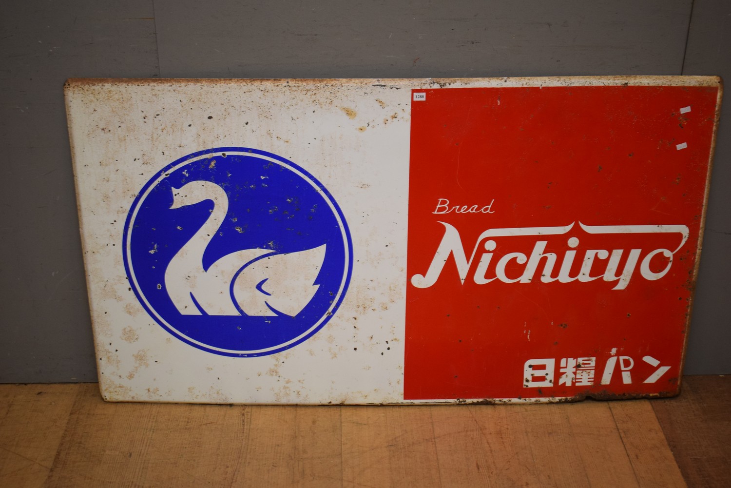 LARGE 1940S JAPANESE NICHIRYO BREAD RED WHITE AND BLUE ENAMEL SIGN WITH SWAN MOTIF (A/F) (80H x 140W CM) (LEONARD JOEL DELIVERY SIZE: LARGE)