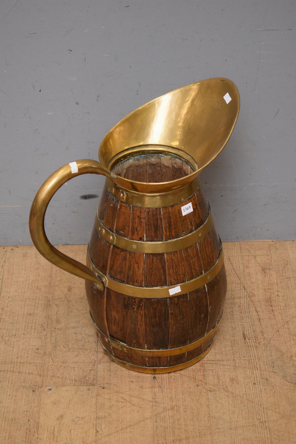 LARGE 19TH CENTURY FRENCH COOPERED WOODEN BRASS BOUND AND MOUNTED WINE JUG (52H x 48W CM) (LEONARD JOEL DELIVERY SIZE: MEDIUM)