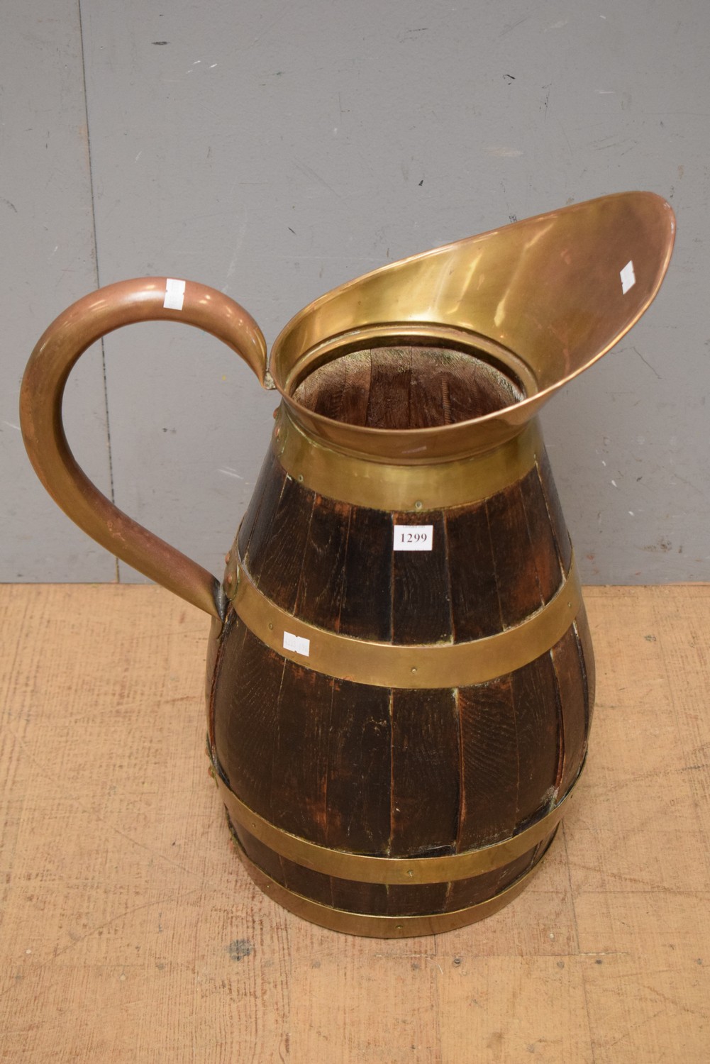 A 19TH CENTURY FRENCH COOPERED WOODEN BRASS BOUND AND MOUNTED WINE JUG (A/F) (55H CM) (LEONARD JOEL DELIVERY SIZE: MEDIUM)