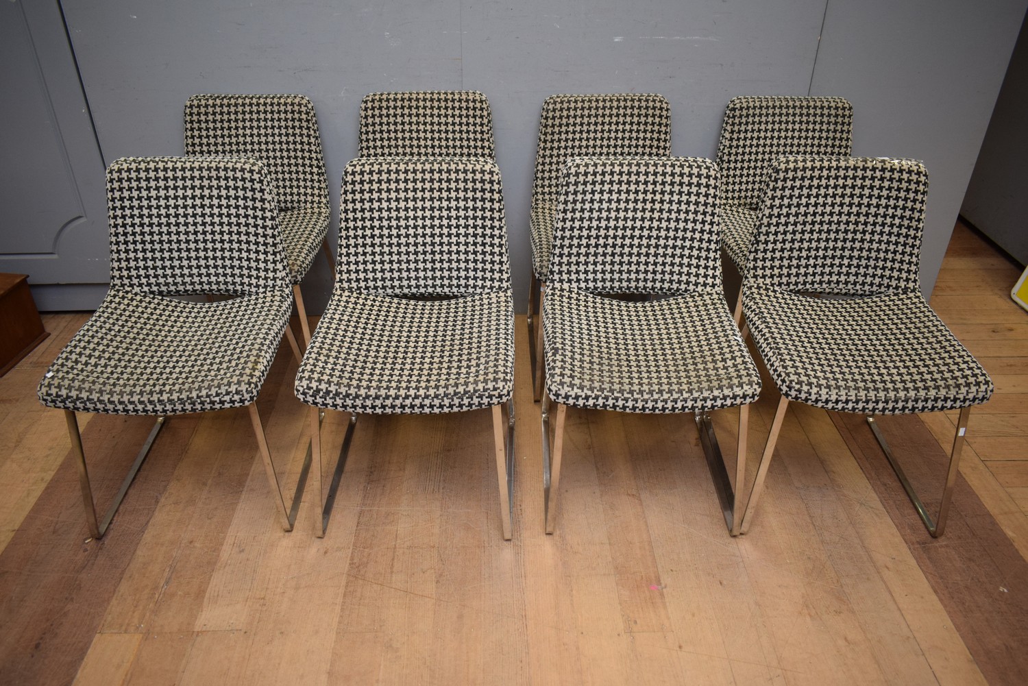 A SET OF EIGHT ITALIAN HEAVY CHROME BASED CHAIRS WITH REMOVABLE ZIP OFF HOUNDS TOOTH CHECK COVERS (81H x 47W x 57D CM) (LEONARD JOEL DELIVERY SIZE: LARGE)