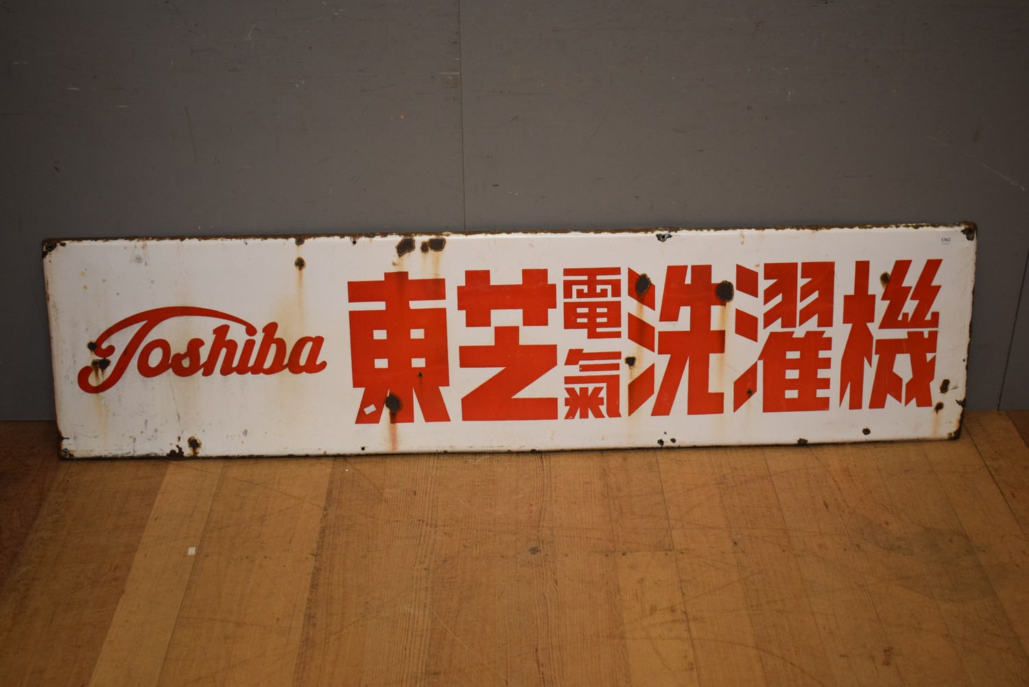 LARGE 1930S JAPANESE TOSHIBA RED AND WHITE ENAMEL SIGN (A/F) (45H x 178W CM) (LEONARD JOEL DELIVERY SIZE: LARGE)