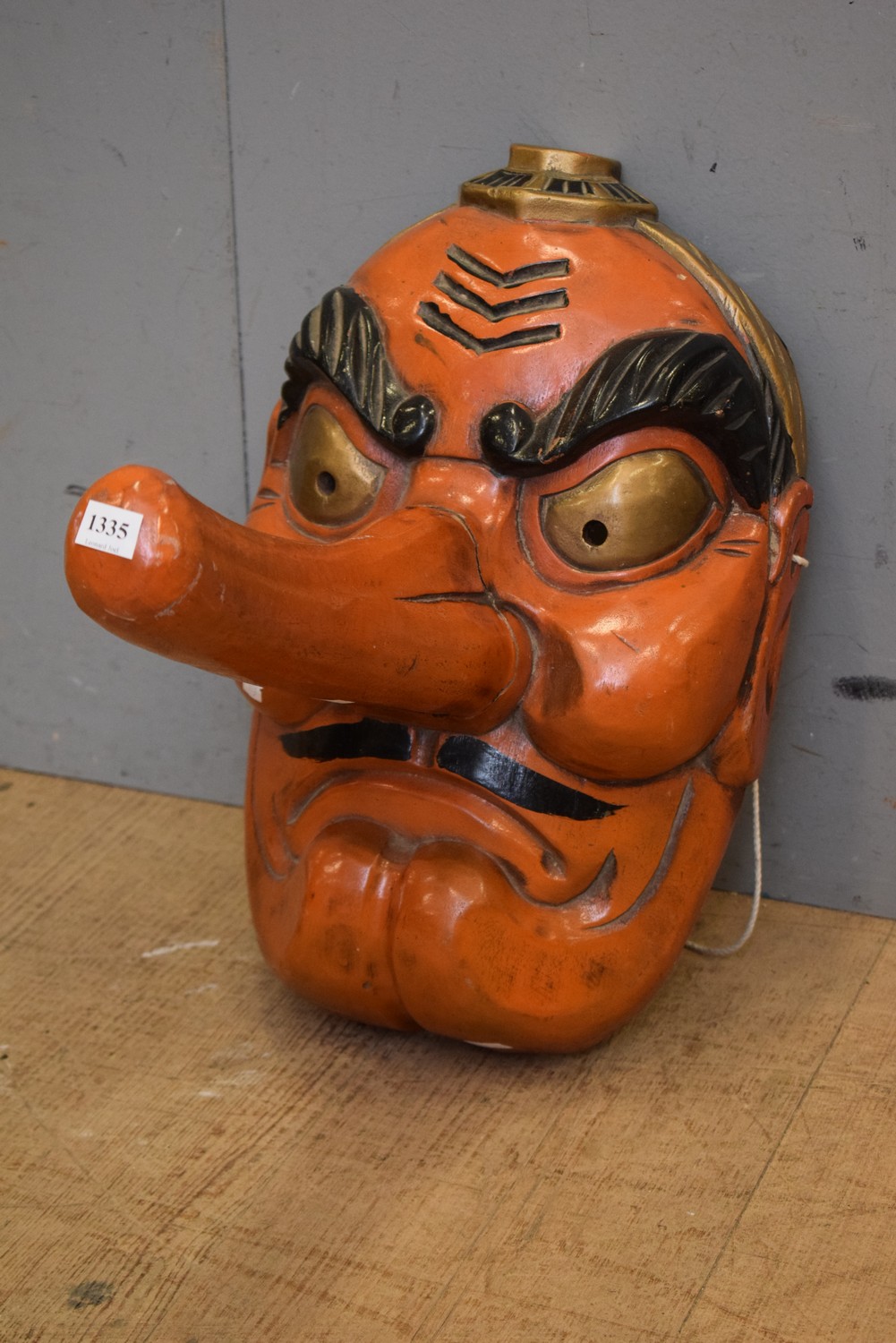 IMPRESSIVE 1920S CARVED WOODEN JAPANESE ENAMELLED CEREMONIAL MASK WITH HUGE NOSE (49H x 28W x 43D CM) (LEONARD JOEL DELIVERY SIZE: MEDIUM)