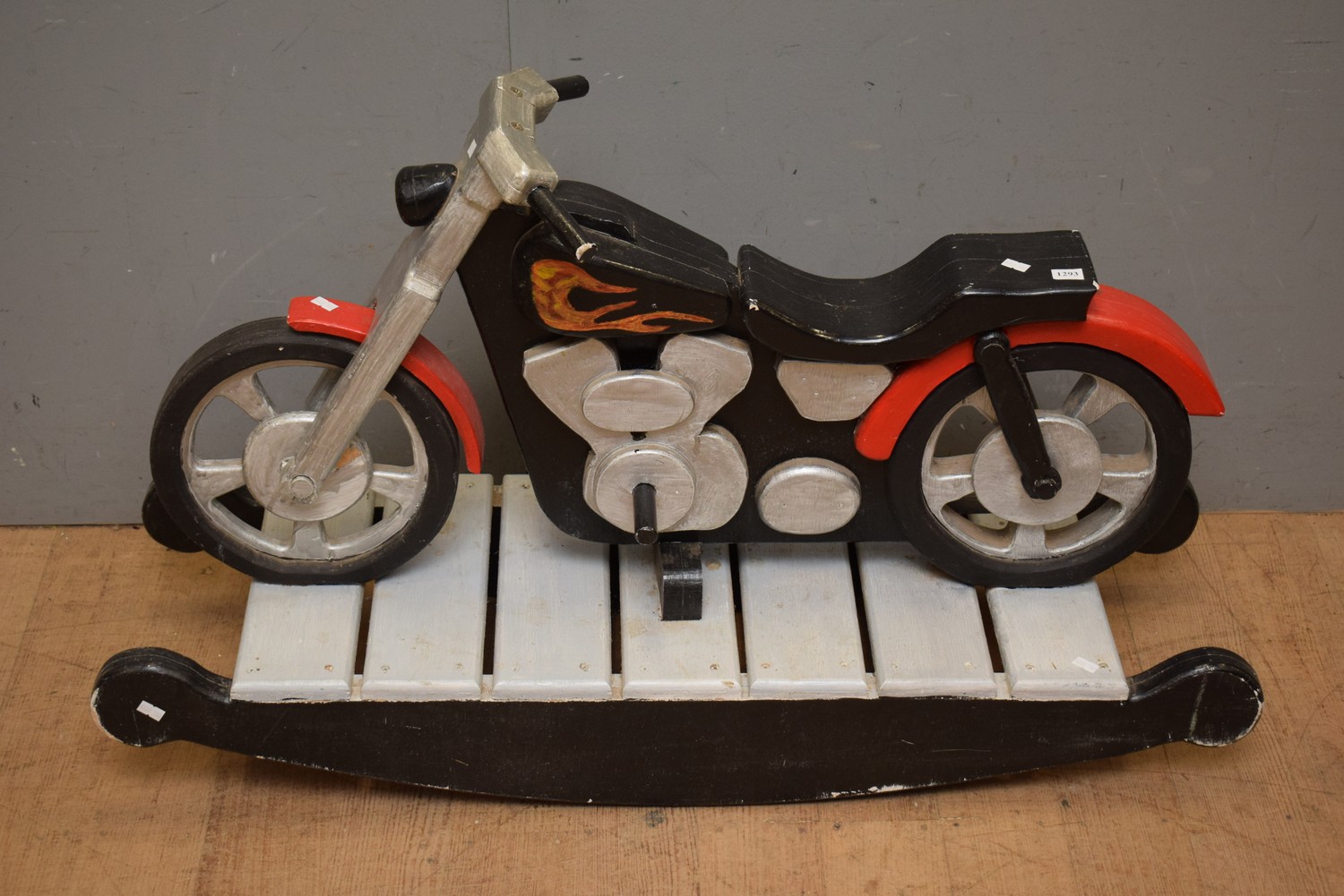 A BESPOKE HAND MADE 1950S WOODEN HARLEY DAVIDSON MOTORCYCLE ROCKING HORSE (63H x 102W x 32D CM) (LEONARD JOEL DELIVERY SIZE: LARGE)