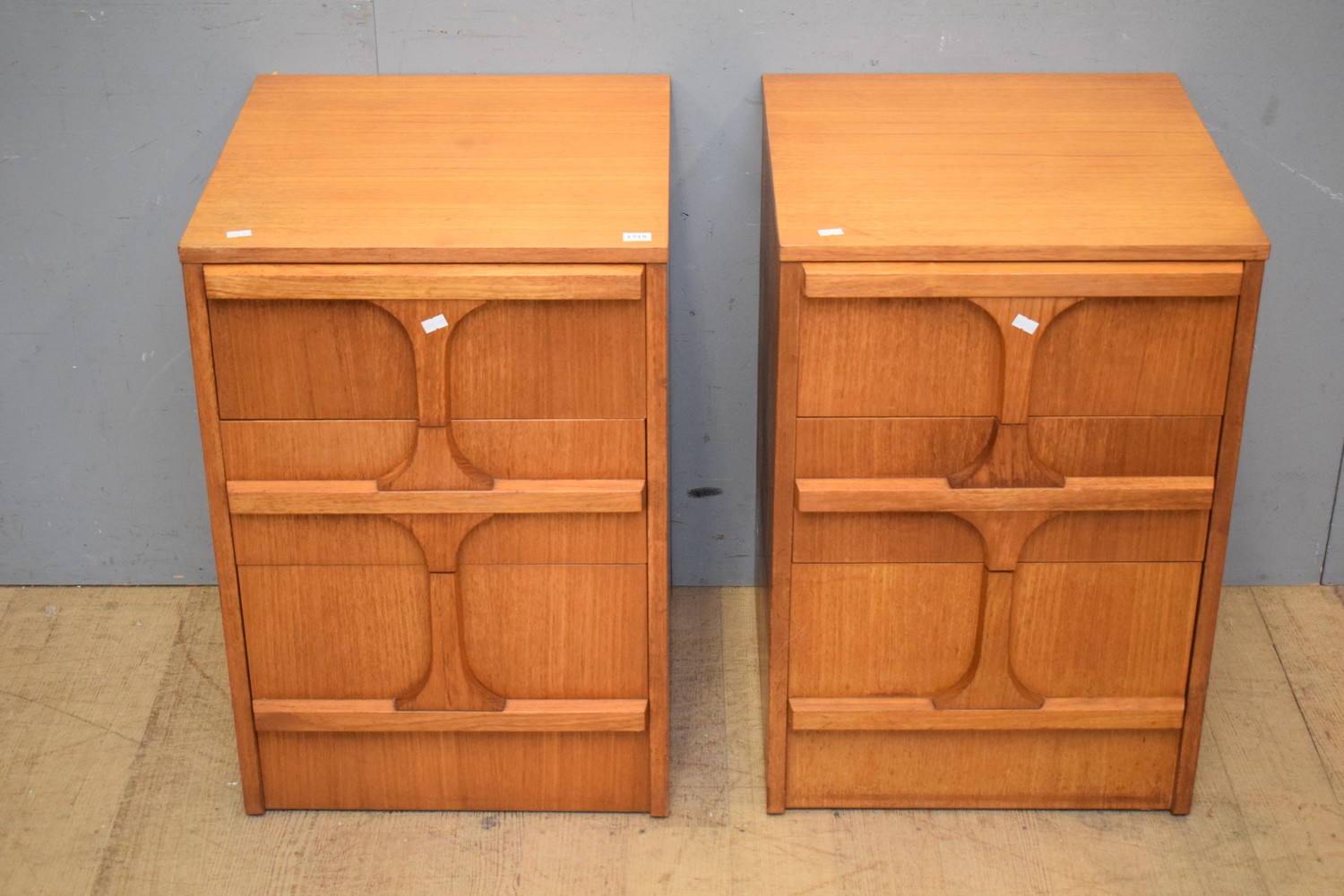 PAIR OF 1960S RETRO AUSTRALIAN TEAK THREE DRAWER BEDSIDE CABINETS (66H x 44W x 45D CM) (LEONARD JOEL DELIVERY SIZE: LARGE)