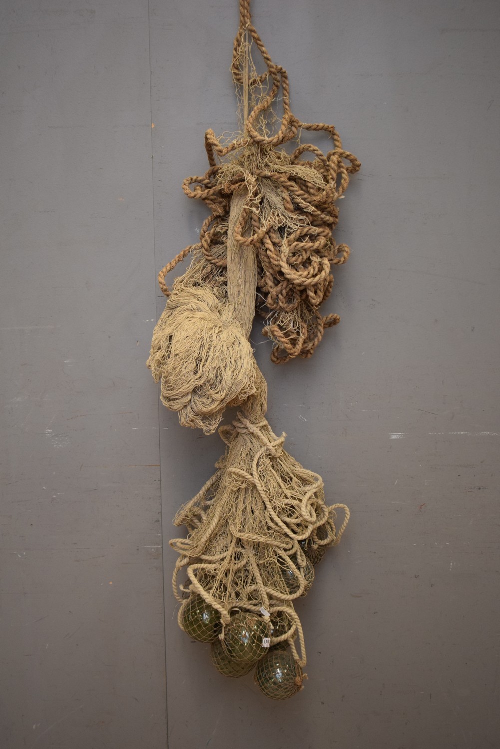 1930S NATURAL FIBRE FISHING NET WITH 11 GLASS FISHING NET FLOATS (130H CM) (LEONARD JOEL DELIVERY SIZE: MEDIUM)