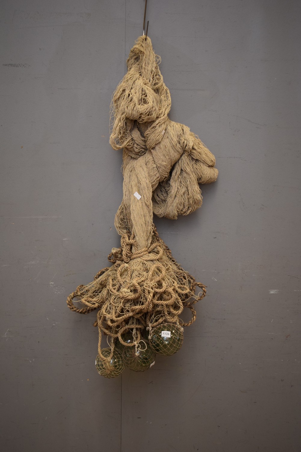 1930S NATURAL FIBRE FISHING NET WITH 6 GLASS FISHING NET FLOATS - PERFECT FOR DISPLAY PURPOSES (97H CM) (LEONARD JOEL DELIVERY SIZE: MEDIUM)