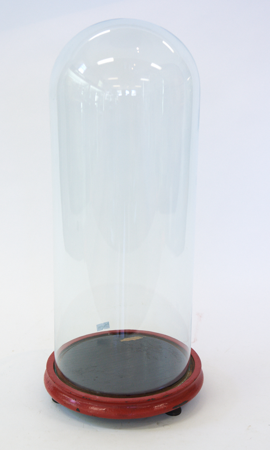 A 19TH CENTURY FRENCH GLASS DOME ON ORIGINAL WOODEN BASE WITH RED HIGHLIGHTS H.55CM, LEONARD JOEL LOCAL DELIVERY SIZE: SMALL