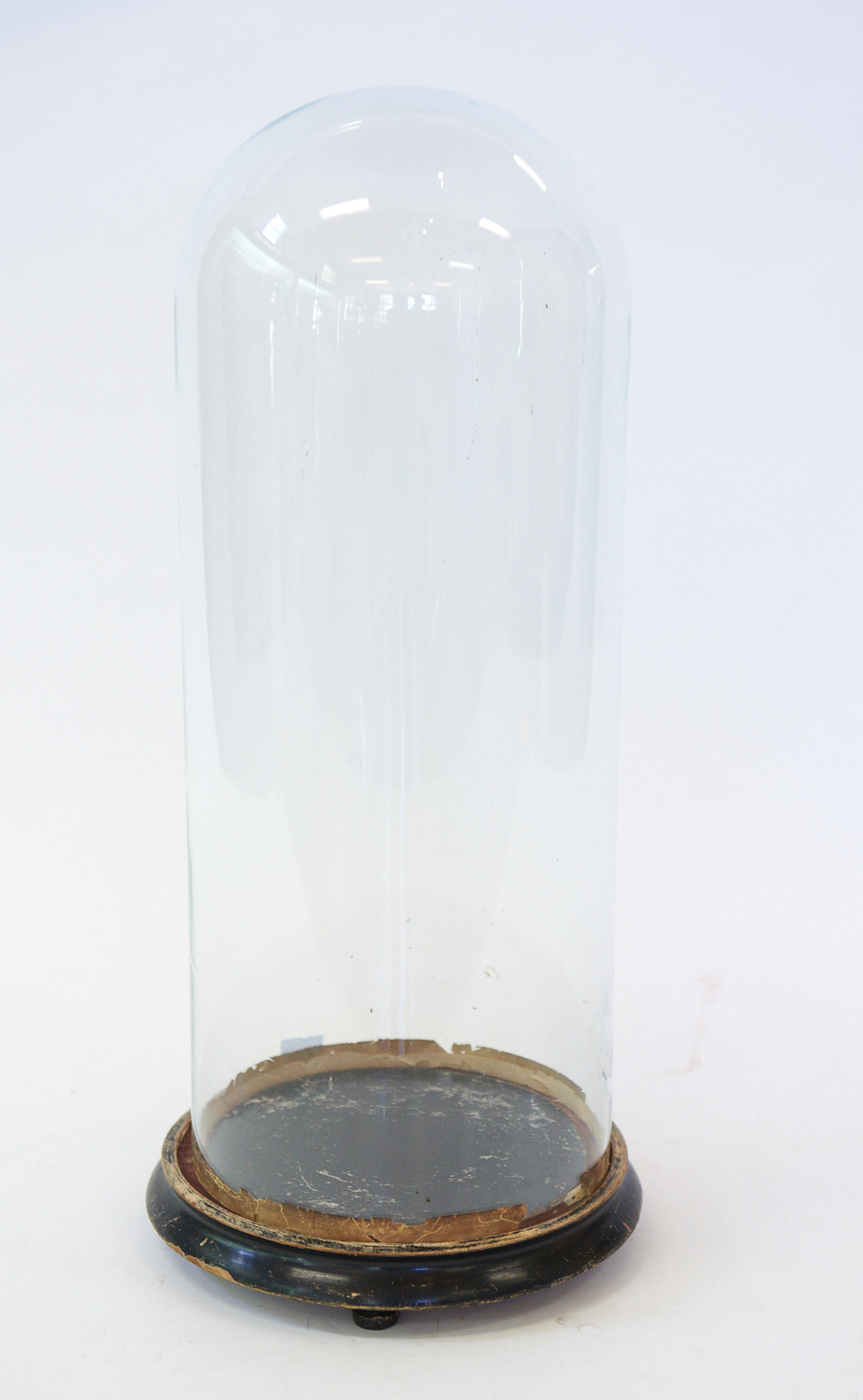 A 19TH CENTURY FRENCH GLASS DOME ON ORIGINAL BLACK WOODEN BASE H.50CM, LEONARD JOEL LOCAL DELIVERY SIZE: SMALL