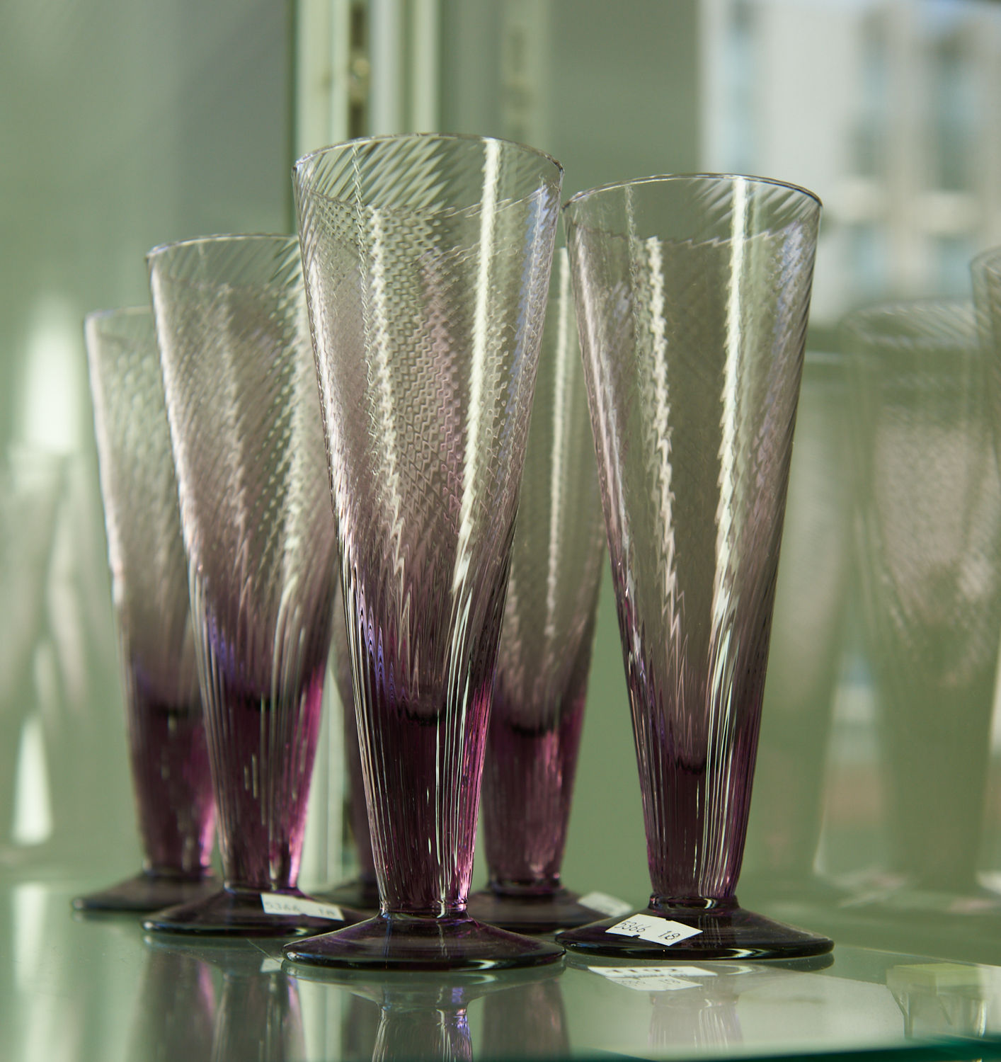 SET OF SIX RETRO ITALIAN PURPLE TWIST DETAILED CHAMPAGNE GLASSES, LEONARD JOEL LOCAL DELIVERY SIZE: SMALL