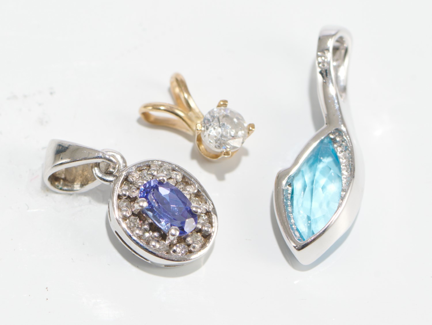 A COLLECTION OF THREE GEM SET PENDANTS, COMPRISING OF AN MARQUISE CUT PENDANT IN 18CT, A ROUND BRILLIANT DIAMOND IN __GOLD AND AN OVAL CUT TANZANITE IN 9CT WHITE GOLD