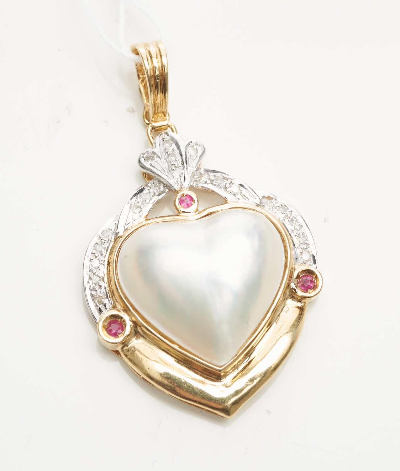 A HEART SHAPED PENDANT/ENHANCER IN 14CT GOLD, COMPRISING PEARL, RUBY AND DIAMOND, LENGTH 40MM, 6.5GMS