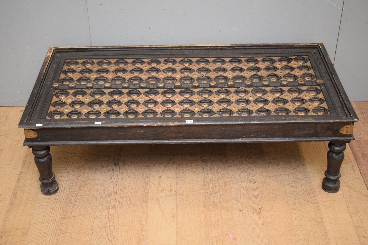 A CARVED TIMBER COFFEE TABLE WITH BRASS DETAILING (A/F) (36H x 122W x 61D CM) (LEONARD JOEL DELIVERY SIZE: LARGE)