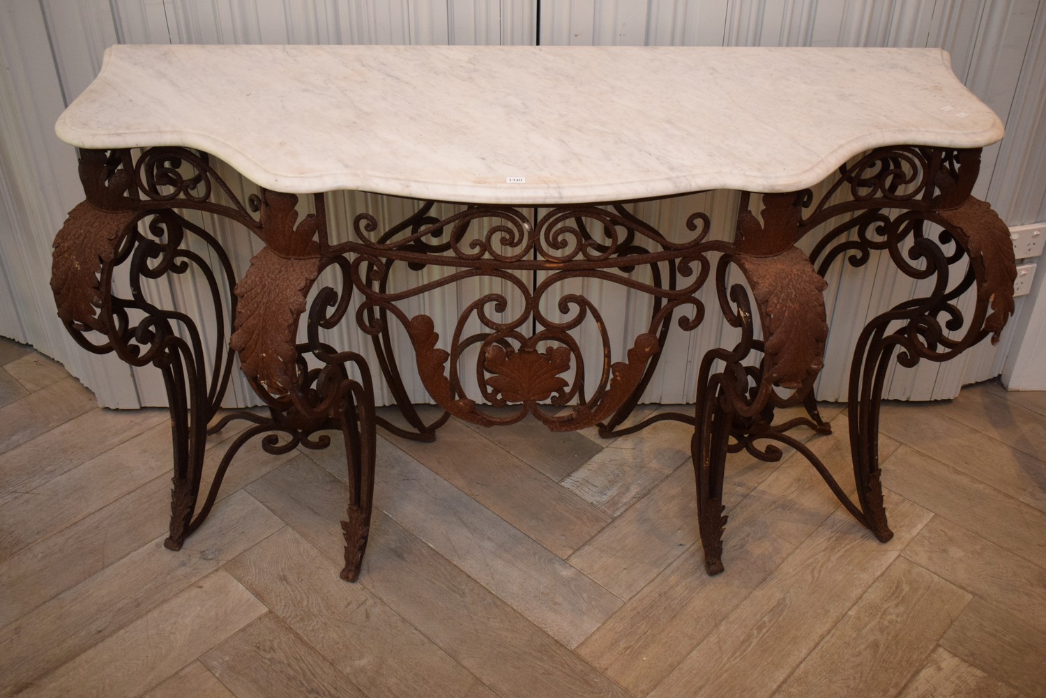 A WROUGHT IRON AND MARBLE TOP CONSOLE TABLE (A/F) (86H x 145W x 59D CM) (PLEASE NOTE THIS HEAVY ITEM MUST BE REMOVED BY CARRIERS AT THE CUSTOMER'S EXPENSE. LEONARD JOEL STAFF CANNOT ASSIST CARRYING THIS ITEM) (X-LARGE ITEM)