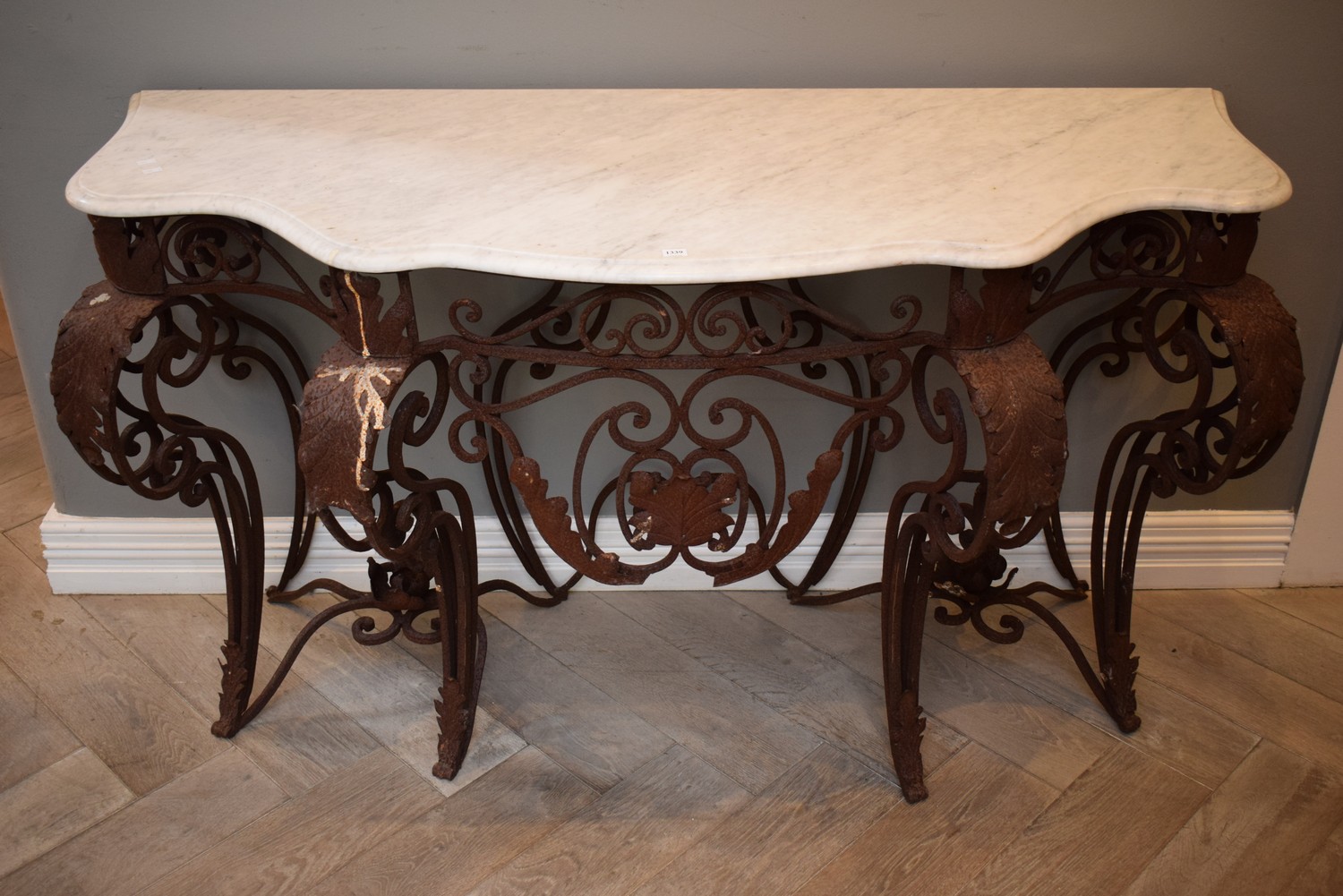 A WROUGHT IRON AND MARBLE TOP CONSOLE TABLE (A/F) (86H x 145W x 59D CM) (PLEASE NOTE THIS HEAVY ITEM MUST BE REMOVED BY CARRIERS AT THE CUSTOMER'S EXPENSE. LEONARD JOEL STAFF CANNOT ASSIST CARRYING THIS ITEM) (X-LARGE ITEM)