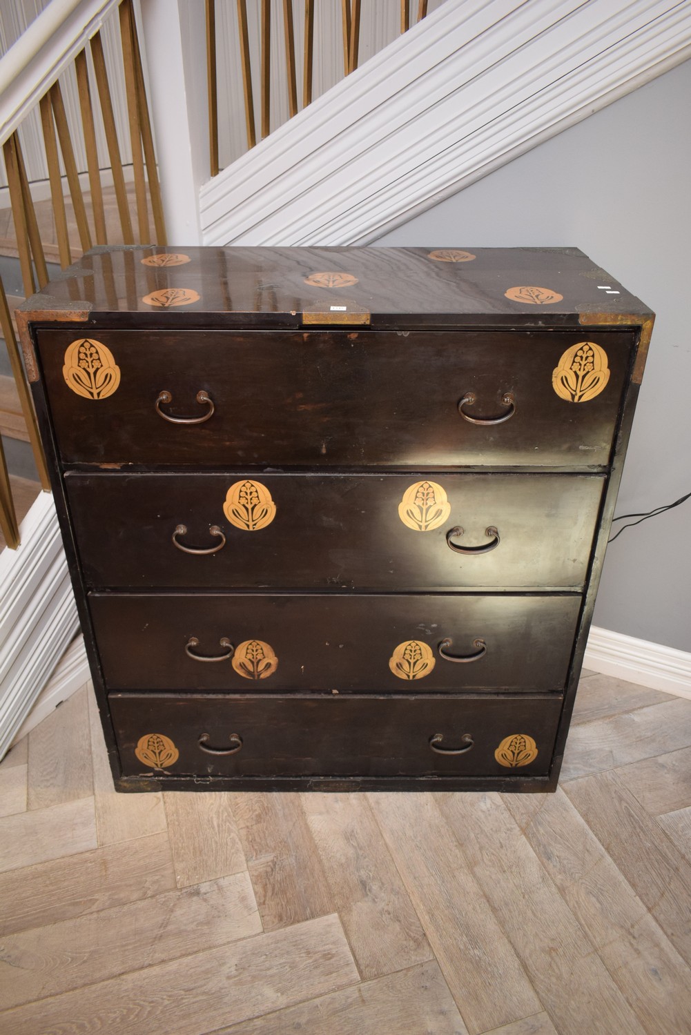 A JAPANESE BLACK LACQUERED FOUR DRAWER CHEST (113H x 99W x 49D CM) (PLEASE NOTE THIS HEAVY ITEM MUST BE REMOVED BY CARRIERS AT THE CUSTOMER'S EXPENSE. LEONARD JOEL STAFF CANNOT ASSIST CARRYING THIS ITEM) (X-LARGE ITEM)