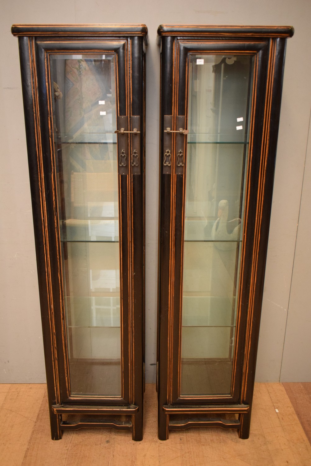 A PAIR OF ORIENTAL GLAZED DISPLAY CABINETS (A/F) (188H x 50W x 45D CM) (PLEASE NOTE THIS HEAVY ITEM MUST BE REMOVED BY CARRIERS AT THE CUSTOMER'S EXPENSE. LEONARD JOEL STAFF CANNOT ASSIST CARRYING THIS ITEM) (X-LARGE ITEM)